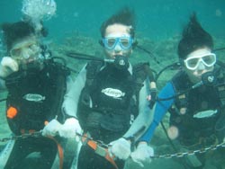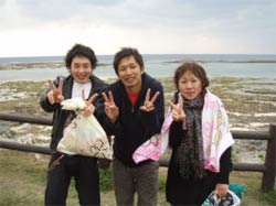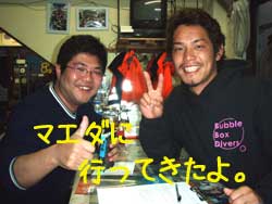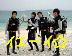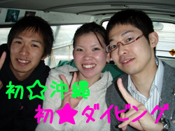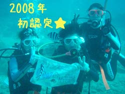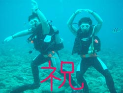 こんにちはぁ☆今日は2008年・最初のOWダイバーさんが誕生しましたよー♪♪FUNダイブで遊びに来てくれている恵ちゃんのお友達。えっちゃん&プリンスです!!2人とも頑張りました!1番の敵は寒さ(>。<)昨日の奥武島の水温17℃!?25分が限界でした・・・でも、そのお陰で22℃の砂辺は快適でしたね(^^;そして、ラストDIVEでは恵ちゃん&タイガーマスクも駆けつけてくれ、水中で一緒にお祝いしました★合格おめでとぉぉぉ♪♪暖かい海でいっぱい潜って、どんどん上手になっちゃって下さいね!!また一緒に潜りましょう! |