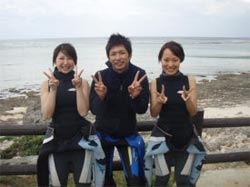 こんにちは〜〜!!潤です★お店の改装もほぼ完成を迎えてきた頃、初沖縄♪初ダイビング♪をしにやって来てくれたのは、タカシさんとマオさんです!!青の洞窟に行きたいとの事だったのですが、洞窟の機嫌が悪く、機嫌の良い本部の方にポイントチェンジ!今度は、洞窟の機嫌をとっておいて潜れるようにしておきますね〜!!そんな中でも、初めてとは思えないほどとても上手に泳げていましたね☆魚にエサをあげた時はワッサーッと襲われそうなくらい魚が寄ってきたり、クマノミを見た時は『ニモ〜!!』と喜んでもらったり、今日はとても楽しかったですね!!次回は、青空カンカンのもとで潜りましょう!!!また遊びに来て下さいね〜〜☆☆☆ |