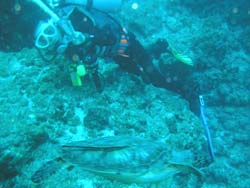 今日は横浜から来た黒田ぱぱのレスキューダイバー講習、午前中に今までならったレスキューダイバーの総復習!そして見事合格です。少し海が荒れている中、頑張りました、途中で足がガクガクしながらも スタッフの潤をかつぎ最後は人工呼吸、黒田パパをレスキューしないといけないかも・・・・なんてぐらい ぐったりしていましたが、見事やりとうしました。ダイバーとして一皮むけた黒田パパなのでありました。合格おめでとう〜その後午後はこの時期は 珍しい真栄田岬にファンダイブへ、いや〜楽しかったです。人も少なく、水深-35mまで行き ウミウシがいっぱい居ました。少し冷たかったけどそれでも水温は20度前後そしてそして な、んと今年初 カメです。真栄田岬も例年人が多くなり大物が少なくなりましたが、アオウミガメです。かなり近くで観察する事ができました。昔は マンタもカメもナポレオンも見たんだけどな〜〜でもでも 普段見れないところでのカメは とっても とっても感動 そして 黒田パパと一緒に二人じめでゆっくり見れたのも嬉しかったです。今年も 楽しいダイビングになりそうです。黒田ぱぱレスキューダイバー合格おめでとう〜! |