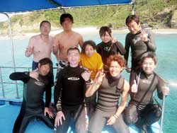 今日も元気にケラマ行ってきましたよ〜☆今日のメンバーは昨日から引き続いてのメンバーたかちゃん・まゆちゃん・ポンポンさんと急遽遊びに来てくれる事になったお久しぶりの小竹さんとオープンウオーター最終日のナッキーの5名です!!!今日の一本目は前島パライソからエントリーしました!!ここではサメ狙いでデンジャラスな気分を味わおうと思い探していたのですが・・・残念ながら姿を見る事はできず。残念。。気を取り直してギシップに移動してカミグーでエントリー!ここではカメ狙いで入ったけど潜り初めて10分・・20分・・・姿かたちも見えないカメにみんなも不安・・俺も不安が。。しか〜し!!最後の最後にやっとサンゴの上で休憩しているアオウミガメを発見!!!ここ最近目当ての生物に出会えていなかったのでホントにほっとしました。。それからのんびりお昼ご飯を食べて三本目は渡嘉敷島の野崎でエントリー!!最近魚の数が半端なく多い野崎!!これにはみんなも大感動☆★サンゴもキレイでした。オープンウオーターの最終日のナッキーもラストスキルを終了して無事合格です★☆★☆おめでと〜パフパフパフパフパフ☆★☆★やっぱりみんなでワイワイ潜ると楽しいですね。夜は合格祝いでかんぱ〜い!! |