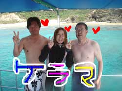 はいさい!!あかねです☆今日はケラマに行ってきましたよー♪昨日から引き続きの与田さん☆小川さん☆と一緒に体験ダイビングです♪ケラマの海は青い!!写真の通りの青さです!!めーっちゃキレイです!!今日も2ダイブがっつり潜ってきましたよー!!ケラマの海はサカナがいーっぱぃ!!沖縄の県魚グルクンも群れてました♪与田さんも小川さんも、もぉ今日はばっちり!!自分達でスイスイ泳ぎまくりです☆耳抜きも完璧です!!今日は大きな伊勢エビも穴の中で発見!!いろんなサカナをたくさん見ましたね☆2日間お疲れ様でした!!この2日間で、2人はもぉかなり立派なダイバーです(笑)ライセンス持ちのダイバーに負けないぐらいです!!ぜひ次回はライセンスに挑戦してくださいね!!沖縄で待ってますよー♪♪ |