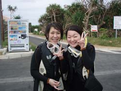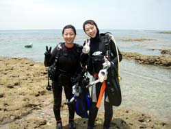 こんにちは〜〜!!今日は、北海道からお越しのナオミさん、カスミちゃんと砂辺で体験ダイビングでした〜★★二人とも以前に体験ダイビングをした事があるとの事で練習もスムーズに進みいざ海の中へ!!水中では、ニモを見たり魚にエサをあげたり、やわらかいサンゴを触ったりと水中を満喫してもらえましたか??また沖縄に遊びにきて下さいね〜〜☆☆とっても上手だったお二人、今度はぜひライセンスにチャレンジしてみてね〜〜♪♪♪ |