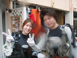 はいほ〜ひろあきです!!今日は久しぶりにオープンウオーターダイバー認定です!!今回スクールに参加してくれたのは、マイペースなできる男!!レイくんと、おっちょこちょいなキラちゃんのお二人です☆会ってからすぐに仲良しになった二人はしっかりバディシステムで協力して数あるスキルを猛特訓!!二日目には水中での浮力調節をほぼマスターし最終日はケラマでの講習になりました!!しか〜し、思った以上に船が揺れて一本目からかなりグロッキーな二人・・・。でも海に入ったとたんコバルト蒼い水中を見てテンションが上がったらしく水中では元気に泳ぎまわって楽しんでいましたね。最後は念願のカメを探してエントリー☆いるかな〜いるかな〜ってキョロキョロして泳いでいるとまだ小さいタイマイを発見!!一瞬みんなのエアーがボコボコって早くなって必死に近くまでいってご対面!こっちにはあまり警戒していないみたいでマイペースに岩の中を探索しているカメは超〜かわいかったです☆そしてみんなで集合して合格祝い!レイくんきらちゃんオープンウオーター合格です☆おめでと〜〜パフパフパフパフパフ☆★☆★☆★ また一緒に潜れるのを楽しみにしていま〜す!! |