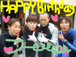 こんにちは〜〜!!今日は、本日お誕生日というエミコさんとユウキさんとハッピーバースデイ体験ダイビングで〜〜す☆☆最初は怖がっていたエミコさんも、だんだん水中世界に慣れていき、魚にエサをあげたり、ニモを見たりとダイビングを満喫してもらえましたか??来年のお誕生日にも、また遊びに来て下さいね〜〜!!笑 ユウキさんはとっても上手だったので、今度はぜひライセンスでのお越しもお待ちしていま〜〜す♪♪♪ |