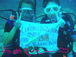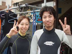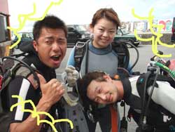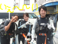 !!!!。ワンタンでーす!!今日は体験ダイビングでーす!メンバーはクニヒコさん!ジュンコさんが参加してくれましたーーー!ちょっぴりドキドキしていたジュンコさんも浅瀬でたっぷり練習したら一人で泳げるくらいまでになりました!クニヒコさんは最初から余裕余裕(笑)。たっぷりサカナにゴハンをあげたり、ニモにも挨拶することができましたね!今度はお二人でライセンスに挑戦してくださいね! |