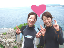 野菜がぁーーき・ら・い!!はいワンタンでーす!!今日は神秘の蒼さがすごい真栄田岬の洞窟スノーケルに行ってきました!!参加してくれた人は・・・神戸からお越しのノゾミさん!とノリコさん!でーす!ライセンスをお持ちと言うことで流石に上手かった〜!ライフジャケットは二分でいらなく?むしろ邪魔になりましたね(笑)。洞窟の中も魚がたっくさん!気持ち悪いくらい群れていましたね!水面の青い光もキレイだったでしょー!オレの変なワッカ?もうまくいったし(笑)。今度はダイビングの方で待ってますね〜!! |