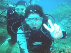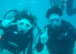 はいさい!!あかねです♪今日は☆とってもかわぃくて元気いっぱぃの体験ダイバーです!!☆ともこちゃん☆のりこちゃん☆です!!水中では・・・2人共落ち着いていてすんごく上手!!最初から、呼吸もバッチグー☆耳抜きもがんばったね!!海の中は、お魚でいっぱぃです!!自分達の手でエサをあげることが、できたでしょ!?いーっぱぃの魚がよってきたね♪そして、ニモもばっちり見たねぇぇー!!キレイなオレンジ色でかわぃかったね☆写真上手に写ってましたかぁぁ〜??またダイビングしにきて下さいー!!今日はとても楽しかったですねぇぇ♪♪また、遊びに来てくださいーねー!! |
