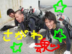 こんんちは〜〜!!今日は、名古屋からやってきた3人組アーサー、ジャパ、グッチと砂辺と真栄田で体験ダイビングでした☆☆まずは、砂辺でダイビングに挑戦!!最初から元気全開の3にんは、余裕で水中をスイスイと泳ぎまわって、魚にエサをあげたり、柔らかいサンゴを触ったりと遊びまわっていましたね!!午後からはいよいよ今回のダイビングの目標でもあった、蒼の洞窟へ向け出発♪♪すんごい、すんごい蒼くて神秘的だったでしょ〜???また癒されたいときは潜りに来てね〜!!! |