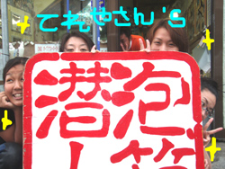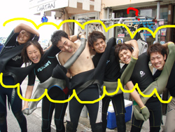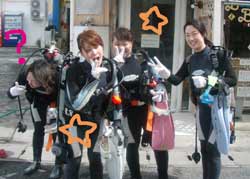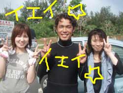 始まりは夢の終わり・・・。あざーーーーっす!!なんとなく言って見ました的なワンタンでーーっす!今日は砂辺で体験ダイビング!メンバーはカオリさーん!ナオミさーん!ユカコさーん!マチコさーんでっす!最初はドキドキしながらも水面で呼吸の練習!ん〜さすがみんなうまかったぁー!だからみんなで集合写真を取ったり、魚にエサをあげたり、やわらかいサンゴに触ったり、お!そだそうだ!ニモにも会えたしね!!イソギンチャクもスゴイ感触だったでしょー!ついでにブリーフだしね(笑)。またみんなで沖縄に来る機会あったら遊びにきてねー!