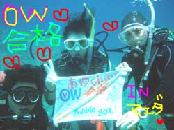 AOWチーム☆はいさい!!あかねです♪今日はケラマに行ってきましたぁぁ〜!!メンバーは☆りょーこちゃん☆えみちゃん☆ごうたくん☆です!!ケラマでがっつり3DIVEしてきましたよん♪1本目はナガンヌ北☆Deep講習☆-30mオーバーの世界を体験してきましたー!!ペットボトルもすんごい形になってましたね(笑)2本目は黒島北でドリフト講習です〜♪♪フロート☆ブシューッと上げて〜水面でボートをプカプカ待ち♪ボートにpicupしてもらいました!!みんな初めてのドリフト体験!!そして3本目は本島に戻ってきて残波☆ミシラギ☆フォト講習です♪写真をパシャパシャ撮りまくり!!地形がとってもおもしろいポイントでしたね!!そして、今日で晴れて3人は・・・AOWダイバー合格でーす!!おめでとーございます!!かっこいいダイバー誕生です☆