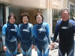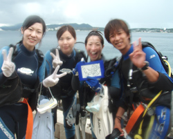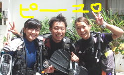 こんにちはぁ☆今日は昨日、ダイバーになったあっきー・えみちゃん・おーちゃんと2日間一緒に頑張ったみゆみゆの最終日!初めはボロボロだった(笑)学科もなんと満点で合格★青空教室のお陰だぁね(^^)そして、海も今日はガッツリ3ダイブ♪真栄田の階段も頑張って3往復してきました!!初めは呼吸や耳抜き、バランスなど・・・イロイロなことに戸惑っていたみゆみゆでしたが今日は見違えるようにスイスイ泳ぎ回っていたね!!3日間ホントにお疲れ様でした!OW合格おめでとぉぉぉ☆★☆ステキな写真もいっぱい撮れたようなのでぜひぜひお店に送って下さいね!!次潜りに来てくれたときにはお店に飾ってあるはず(^^)これから、いろんな海でたくさんの思い出を作ってください!また一緒に潜りましょうね♪ |