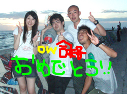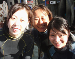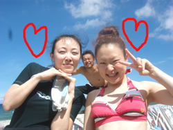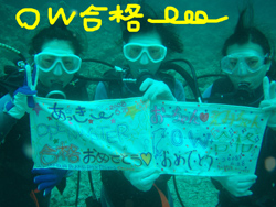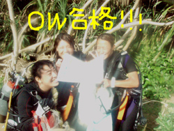 こんにちはぁ☆今日は3名のダイバーさんが誕生しましたよぉ★☆★まずは去年、体験ダイビングをしに来てくれた雨女!?あっきー。8月にハネムーンでモルディブに行く予定のえみちゃん。その旅行の案内をしたJTAおーちゃんです!!初日はすんごい豪雨の中のダイビングから始まり、空腹や眠気に耐えた学科(^^;2日目からは真夏のような日差しに恵まれ、休憩中は写真撮ったりとリゾートを感じながら潜り、学科は無事に合格♪おめでとぉ♪♪そして潜るだけの3日目も太陽サンサン★1本目は残りのスキルを頑張って、ラスト2本目は遊ぶだけ〜!!!お魚たちに襲われ・・・じゃなくてエサをあげたり、スイスイ泳ぎ回っている立派なダイバー姿を写真に撮ったりしてきました(^^)最後は抜き打ちテストもし・・・無地にダイバー★あっきー・えみちゃん・おーちゃんの誕生です!!おめでとぉ☆★☆3日間の階段往復お疲れ様でした(笑)これに懲りずにまた遊びに来て下さいね!!楽しみに待ってます♪♪♪ |