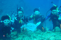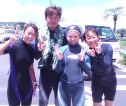 とうとう6月も最終日。もう一年の半分が終わっちゃったんですね〜早いもんです!さぁ〜今日の沖縄は!?朝からピーカン照りのお天気です!暑い・・・。そんなラッキーな日に遊びに来てくれたのは、元気な白い天使の4人組、かぁさん・おがわ・さかちん・やよいちゃんです!真栄田岬は連日のベタ凪で透明度も抜群☆★みんなとっても上手に水中の中にエントリーしました。群がってくる魚に目を輝かせて餌付けを楽しんで水中遊泳〜★フワフワの感覚が気持ち良さそうでした。そして二本目は希望であった青の洞窟へ!!洞窟内はちょうど貸切で青の光を贅沢に浴びまくりました。洞窟の出口にはリュウキュウハタンポの幼魚がたっくさん群れててこれがまたキレイでみんな見とれていました。記念写真のポーズもばっちりきまって今日のダイビングは終了しました。また沖縄に来た時は遊びに来てね〜☆ |