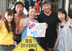 こんにちはぁ☆今日、一緒に潜ったのは3年前にBBともさんと潜った隆さん&淑子さん。スノーケルの千寿子さんのお母さん。元気な靖子ママです(^^)水中世界になかなか慣れなくて苦戦した方や全然余裕で楽しんでる方それぞれでしたが、最後はみぃ〜んなスイスイ泳ぎ回り、お魚達に襲われてる!?ようにエサをあげたり、大きなタイの仲間やニモなどを見てきましたぁ!!隆さん&淑子さんはまた来年??靖子ママは明日も楽しみましょうね! |