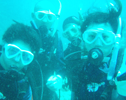 兵庫からお越しの森さん仲良しファミリ〜の体験ダイビングです。この沖縄旅行は娘さんから『父の日』のプレゼントだそうです。なんていい話なんでしょう〜。りょうこ感動です!海人慎一パパ&ドキドキ緊張のみどりママ&ワクワクのまきこちゃん&じゅんこちゃん!みんなでウェットスーツに着替えて海へ!まずは浅瀬で練習です。少しするとみんな、随分呼吸になれてきたみたい。耳抜きも順調です!そして、お魚にエサをあげたり、写真をとったり、更にななんと、本物のニモがいるところまで、みーんなで泳いでいけちゃった!GooD JOB!!沖縄の海の中はいかがでしたか?みんなとても上手でしたよ。素敵な森もりファミリーとご一緒できて私達も楽しかったです。また会える日を楽しみにしていますね。(^^) |