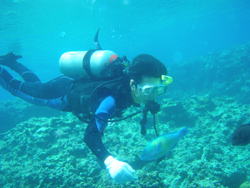 3時から元気に潜りに来てくれたのは仲良しカップルタイちゃん&サーモン!そしてとっても陽気なカメちゃん!です☆3人は来た時からノリノリ♪であだ名がみ〜んな海洋生物になっちゃいました!笑 本名と全く関係ないです。そんな3人は緊張していると言っていた割りにかなりリラ〜ックスした状態でのエントリー☆水中でもたくさんのお魚にエサをあげて遊んだり、ゆっくりニモのお友達のクマノミを見たりしましたね♪その後はみんなふわ〜っと自由に空を飛ぶように、水中をスイスイ泳ぎ回りました!!とっても不思議な感覚だったでしょ?? みんなすごく上手だったのでぜひ!ライセンス取得でも、ガッツリ2本!蒼の洞窟コースでもチャレンジしに来て下さいね♪ |