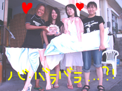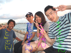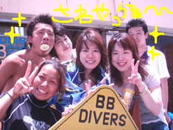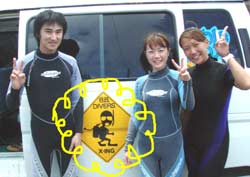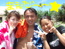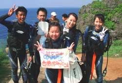 沖縄今日のいい天気〜。朝少し早めに真栄田岬に集合!ダイビングDコースへはりきってGO!メンバーは、徳島からきてくれた女の子ゆりこちゃん&ちせちゃん、笑顔の素敵な亀井まさひこさん&あけみさん、東京おな○チーム小林班長、中国からのしゅうちゃん&こうちゃんの7名そしてスタッフ3名の計10名でわいわい海へ!1ダイブ目では、お魚にエサをあげたり、ニモの友達をみたり、写真をとったり、サヨリの大群、もいました。そして2ダイブ目では洞窟に挑戦!みんなでガンガン泳いでいきました!そしてあの!洞窟のブルー!!神秘的でした。ダイバーのシルエットも雑誌の1ページのようでしたね。みんなと一緒に遊べて私達も楽しかったです!亀井さんライセンスバッチリレベルですよ!チャンスがあったら、是非挑戦してみて下さいね!ゆり&ちせちゃん2人で協力して泳ぐ姿かわいかったですよ♪小林さんまたいつでも遊びにきてくださいよ(^^) |