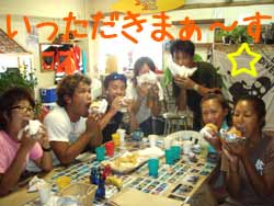 こんにちわ!しげちゃんです。今回、男女7人で体験ダイビングに参加してくれたのは智也くん・世津子ちゃん・幹子ちゃん・ゆかりちゃん・章太郎くん・弘己ちゃん・侑範くんです。お店での説明も順調に進んで行進のように一列になって海の中へ!たくさんのお魚達に出迎えられて いざ餌付けターーイム!! 少しビビリながら(?)も間近でいっぱいのお魚をみれましたね☆ 餌付けが終わった後は「みんなでニモに逢いに行こうー!」って事でニモのお家へレッツゴー☆ 白いパンツをはいてるような模様のニモ♪可愛かったですね☆ そして今回参加の侑範くん7月7日がハッピーバースデー!!水中でのバースデーはもちろん初めてだったかな?大きなハマフエフキダイも一緒にお祝いしてくれましたね☆本当におめでとうーーー☆あっと言う間の体験ダイビングもいよいよ終了。と!その時 わんたんさんの必殺バブルリング!(一部の人しか見れなかったかも・・・)綺麗でしたね☆また仲良し7人で遊びに来て下さいねーーー。沖縄でニモと一緒にスタッフ一同待ってまーす♪ |