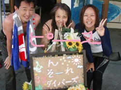 よーし!やってきました!世界の海ケラマ諸島!もうすっかり海の色は夏の色!濃い青さが出ていました!そんな贅沢な海で潜ったのはエミチ!アイコちゃん!さすがに昨日体験ダイビングを2人ともやっているのでちょっと練習しただけですんなり潜る事ができました!みんなでワイワイ楽しく色んな魚をみたり、砂地でフネさんを発見!!しかしフネさんは力尽きるように上へ昇天していきましたとさ(笑)。スノーケルで遊んでいるときは二匹のカメを見つけて大ハシャギ!!そんときだけはみんな泳ぐのが早かたぁ〜(笑)お昼は船から飛んで遊んだりね!!あ〜今日は楽しかったね〜今度はエミチもアイコちゃんもライセンスに挑戦だ!!待ってるよ〜〜! |