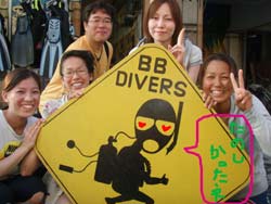 ライ?ライ?ララララーーーーイ!ワンタンでーす!!今日は砂辺で〜〜お買い物〜。夜は砂辺で〜ラララ〜。はいファンダイビングをしてきました〜!メンバーはユウコさん!つるよさん!今さんでーーす!のんびりと一本目はダイビングを楽しんで、みんなでおしゃべりしながら、ながーい休憩をとり2本目はちょっと遠出をしてかわいい魚をたっぷりみてきました!ナカモトイロワケハゼが俄然たのしかった〜!あと大物のシャチ!?ん〜シャチ!でしょう。。人形の・・・ね(笑)。あ〜やっぱりこういうダイビングも最高! |