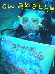 はいさーい!!あかねで〜す♪♪今日は〜OW講習最終日!!一昨日から頑張っている☆みかちゃん☆まず、1本目は砂辺で潜りました!!昨日に引き続きホバリングを頑張って練習です!!コンパスもがんばったね☆そして、今日は少し遊びもまじえてダイビング♪ニモ☆観察!!かわいかったねぇぇ〜☆そして、2本目からは真栄田岬に移動してDIVE!!午後から到着の☆いさぴょん☆つっちー☆どじまちゃん☆も一緒にレッツゴーです♪♪みんなで中性浮力をとりながら上手に潜ります!!洞窟目指して行ってきました☆洞窟の青い光☆洞窟の中にいる魚の群れ☆感動です!!入り口の所のサカナの群れもすごかったねぇぇー☆他にも、いろーんな魚もいっぱぃ見たね!!そして最後に、水中で・・・ごーかーく祝いデス!!そして見事OWダイバーの誕生です!!おめでとーございます!!OW合格おめでとーございます★★★これからも、いろんな海でいっぱぃ潜ってねぇぇー!!そして、午後着チームはもぉ1DIVE行ってきました♪階段頑張ったねぇぇー!!のんびりみんなで潜りました♪また〜みんないつでも遊びに来てねぇぇー☆☆☆ |