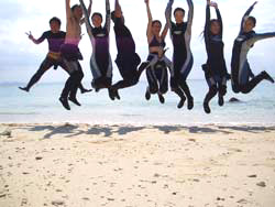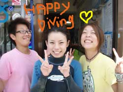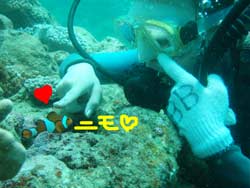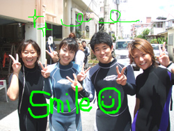 お昼からの体験ダイビングBコースに参加してくれたのは、きしこちゃん&谷口さん&さきちゃんの3名、ライセンスをもってるきしこちゃん、アクティブ派谷口さんは最初から余裕。さきちゃんは実はとってもコワイ。。。と。。。でもでも本当によく頑張ったねすごい上手になりました。最後は自分でバタ足して泳げるほどに!みんなでニモのお友達のクマノミ一家を観察したり、ピンクのニモハナビラくまのみをみたり、水面のキラキラにみとれたり。。沖縄の海のなかはどうでしたか?またいつでも遊びに来て下さいね。 |