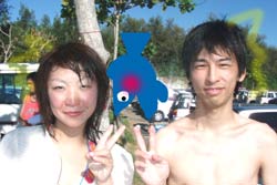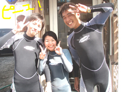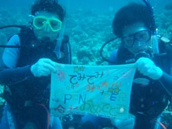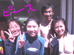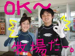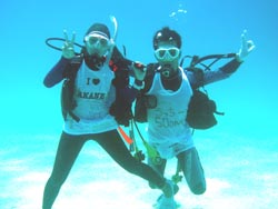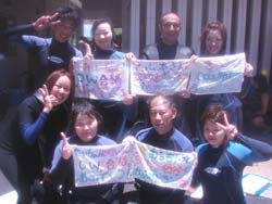 朝一の体験ダイビングに参加してくれたのは、上原さんご夫婦、さわやかな新婚さんカップルです。しんごくん&みほちゃんのお2人、実はスタッフはるひのママのお友達です。2人とも生まれて初めてのダイビングに挑戦です。最初から余裕のしんごさん、ちょっぴり緊張のミホちゃん。でもすぐにダイビングになれて、2人なかよく手をつないでスイスイおよいでました。餌付けをしたら、いっぱいのお魚にかこまれましたね。水面もキラキラととてもキレイでした。そして結婚のお祝いにはるちゃんからの記念ハンカチをプレゼント!写真もとりました。次は、はるとも一緒にもぐれるといいね。いつまでもお幸せに〜。 |