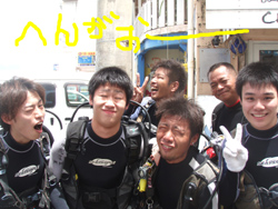 今日も朝から元気に潜りに来てくれたのは社員旅行(??)のヒロフミさん☆タカユキさん★タカヒロさん☆ヒロキさん★ヨウイチさん☆テツヤさん★の6名様でぇす(^^)/ みんな初めてのダイビングでノリノリ♪説明を聞いている時から笑顔でしたね!しっかり練習をして海にエントリ〜♪とっても天気が良かったから海に入った瞬間は気持ち良かったですね♪チョッピリ苦労しながらのエントリーになった人もいたけど、水中に入ってしまえばそこはさすが男組!!すぐに慣れて自分達で泳いでいましたね☆たくさんの魚に囲まれながらエサをあげたりニモの仲間クマノミをみたり...海なのにカッパも出現?!笑 海がちょっぴり怖い人、早く海に入りたい人、マイペースな人...それぞれが放任主義でおもしろかったです♪ゆうりはしっかり突っ込まれてしまいましたが(。。) また沖縄に来た時は遊びに来て下さいね!!次は蒼の洞窟へ行きましょ〜♪ |