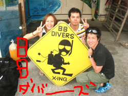 こんにちはぁー★今日は4年ぶり!?のBBご来店。ケインさんこと小杉さんと、長期滞在も明日で終了。ぽんぽこさんと一緒にケラマへ行ってきました!!まず1本目は「冒険してみよー。」とのことで、ガイド含めて全員初めてのポイント(仮)シングルロックです。写真のように【鯉のぼり】ができるくらいの激流でしたが地形がおもしろかったですね(^^)そして、2本目はその疲れを癒してくれる真っ白い砂地ポイント。トウマ。スカシテンジクダイとキンメモドキの超大群がすごかったぁ!!さらに3本目はサンゴがすんごいキレイな野崎です。今日は3ヶ所とも違う雰囲気で楽しかったですね♪♪ぽんぽこさんはさらにナイトへ!?いってらっしゃ〜い☆ |