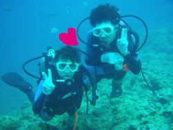 こんにちわ!!重ちゃんです★今回体験ダイビングを楽しんでくれたのは智章くん・恵理ちゃん夫婦でーーす。ダイビング初体験の恵理ちゃん ドキドキハラハラで陸上説明を受けいざ!海の中へ!!初めは緊張したみたいだけど沢山のお魚達に出迎えられて楽しそうでしたねーー(笑)一方 ダイビング経験済みの智章くんは終始落ち着いてましたね☆泳ぎ方もベテランダイバーって感じでした。2人で餌付けをした後 水中をお散歩して「ニモに逢いにいこーーっ」って事で ニモのお家へ・・。指をガジガジしてもらったり写真を撮ったり☆戻る途中にはイカの夫婦にも逢えましたね♪次回は洞窟ダイビングにもチャレンジしてねーーー☆ |