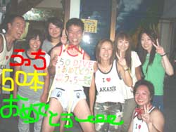 はいさーい!!今日でめでたく☆24才を迎えたあかねでーす♪♪こんな素敵な日に潜りにきてくれたのは☆ゆみちゃん☆ぼんさん☆うっちー☆まるちゃん☆のんちゃん☆です!!本島ボートに行ってきましたよーん♪♪1本目はオーバーヘッドロックにレッツラゴー!!地形ダイビング楽しいです♪あやうくイソギンチャクにヒトデが食べられそうになるところを。。うっちが救出!!みんなひやひやもんでした。。そして、2本目はナカユクイへ!!今日のナカユクイは透明度抜群!!すんごーーーく透き通っていました☆そして、今日の2本目で・・・うっち★祝★50DIVEでーす!!50本とは思えない上手さですが、50本みたいです(笑)しかも、1年で50本達成です!!来年は100本祝いですね☆そして、なんと水中で・・・さすがまるちゃん!!(あかねファンクラブ会員☆)私の誕生日まで祝ってくれましたぁぁー!!みんなからの寄せ書きメッセージの入ったTシャツを水中でプレゼント!!感動で涙が止まりませんでした(ToT)!!ありがとーございます!!そして、真栄田岬に移動して。。どーしても私と潜りたいとごねている斉藤さんと合流☆無事に斉藤さんも合流して3本目は真栄田岬の洞窟に行ってきましたよん♪♪斉藤さん・・・サプライズ登場ありがとう!!さすが、あなたもあかねファンクラブ会員☆ですね!!今日はお祝いたくさん×2ありがとーございました!!しかも、お店に帰るとプレゼントもたくさん☆☆☆わざわざ送ってくれたり♪ほんとーに×2ありがとーございました!!24才ステキなレディー目指してこれからも、頑張っていきたいと思いまーす♪♪ |