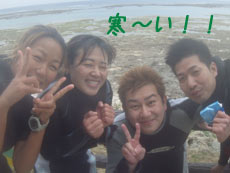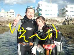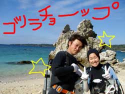 最近の沖縄は北風の影響で本当に寒い・・・。おかげでいつも潜っている砂辺は荒れ荒れなので水族館の近くのゴリラチョップで今日飛び込み参加で関東から遊びに来てくれた、仲良しカップルと楽しく体験ダイビングしてきました★2人のあだ名は、彼氏が「花園」彼女が「サル」というなかなか楽しい2人でした(笑)ダイビングは初めてという事でしたが、とてもすんなり水中の中に入り餌付けをしたり、水中から見る水面のキラキラを見たりと楽しんでくれたみたいです。晴れていればぽかぽか気持ちイイですが、天気が悪いと寒い沖縄なので遊びにこられる方は、上着を持ってきてくださいね★花園とサル!!今度はライセンスに挑戦してみてね★ |