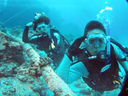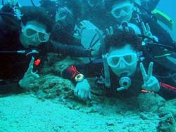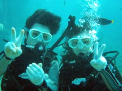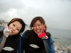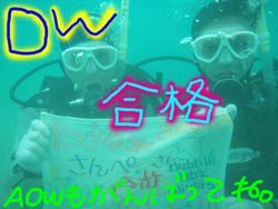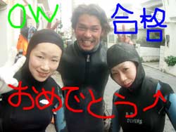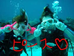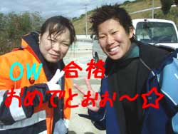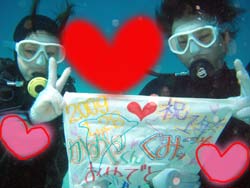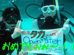 まいど〜ひろあきです!いよいよ明日は関東祭り☆楽しみです!今日は新しいダイバーが誕生しました。関東から遊びに来てくれたお嫁さんのよめとよっちゃんの2人です!!初日はBBのニューイケメンイントラ潤が担当。到着後すぐに海という事で緊張から疲れが出てしまいスキルもちょっと苦戦してしまいましたが・・・二日目以降は体力も回復して初日にできなかったスキルもびっくりすくらいスムーズに進んでいきました。スキルと同様に水中を泳ぐ練習もとても上手な二人は中性浮力を操り自由自在にいろんな水深を泳ぎまくっていました^−^そして最終日!今まで重くて大変だったタンクも普通に背負って歩けるようになり潜行も耳抜きも上手にできるようになりました。そしてラストダイブ!!最後は遊ぶだけのダイビングなので2人も顔がほころんでいました(笑)沖に出ると夏に見れるギンガメアジのようにグルクマがグルグル水面近くを泳ぎまわってソフトコーラルが綺麗でしたね。そして苦手だったマスクスキルも無事終了して見事オープンウオーターダイバー合格です!!おめでと〜〜パフパフパフパフパフ〜〜〜☆☆★☆★★もうこれからは立派なダイバーです。またのんびり遊びに来てね!! |
