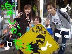 こんにちわーーー!!しげちゃんです★ 今日の体験ダイバーは以前もBBを利用してくれたジュンくん率いる「ビバ30代チーム!」 ケイシさんとタカコさんの3名です、スタッフのしげちゃん、よっしーも もちろん30代♪ マッタリと潜ってきました★ ダイビング初体験のケイシさんとタカコさんでしたがめちゃくちゃ上手に泳いでくれましたよーー!水中では妙な形の大きなサンゴ「ハマサンゴ」がゴロゴロ。魚も小さくて可愛い「ロクセンスズメダイ」がたくさんいましたね、エサをあげると近くまで来てくれました★ みんなで水中をのんびり泳ぎながら ナマコで遊んだり「フグ」を発見したり のんびりかつ たくさんの生物を見ましたね☆ 最後はしげちゃんの「バブルリング」で!! (内心 キレイに出来て ホッ・・・(笑) 次回は暖かい時期に洞窟ダイビングに行きましょうねーーー♪ |
