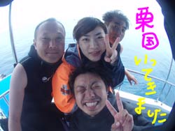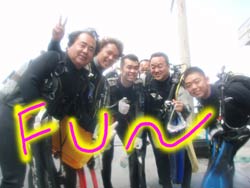 おっす!おれワンタンよろしく!!っはーーい!今日は砂辺でファンダイビングでーす!参加してくれたのは〜中田さーん!シンコウさーん!ぺーちゃん!みっちゃーんでーす!!賑やかにはじまりました午後からのファンダイビング(笑)いきなりシンコウさんがウエットを着てモジモジ。。なにかと思ったら・・どうやら股間のところが破れていたらしく・・恥ずかしかったみたいなんです!みんなで大爆笑でしたね(笑)海の中でもお二人は不思議でした。。30秒に一回は上を見上げて何か悟りを開いていました!でも・・案外なにも考えていなかったりして・・・(笑)。ペーちゃんは相変わらず上手いね!!ミッちゃんも一本目耳抜きが出来なかったものの・・上手だよねー!そしてやっぱり2人がくると潜る前から笑い疲れちゃうから今度は笑い無しね(笑)ここsunabe!あーはい。。いまでもこのフレーズは笑っちゃうよね!!あらたに俺の向こうでの上司の春日部さんがあらたにはいったしね!!あーたのしい一日だった!!またみんなでもぐれたらいいですねーー!! |