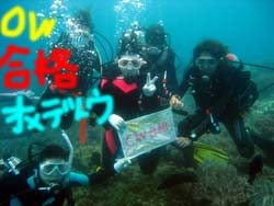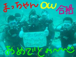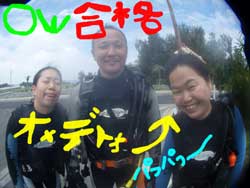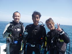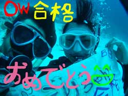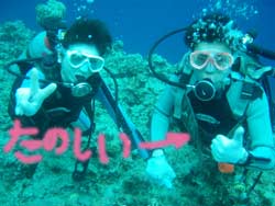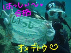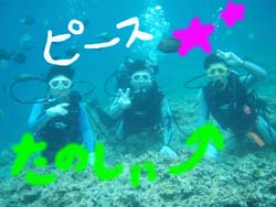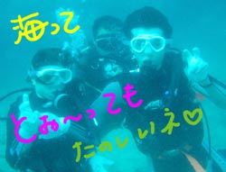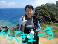 こんにちはーーー!!今日はなんとっ!!新たにダイバーが誕生しましたー!!今日ダイバーになったのは鳥取県からプチ長期できているさんちゃん&ポチコちゃーん♪おめでとー!!なっつさんも一緒に1本目は砂辺、2本目は真栄田に行ってきましたー☆砂辺ではサンゴのお花畑の上を泳ぎまわったりニモに会いにいったりしましたね!2本目の真栄田岬では洞窟に行ったあとみんなでOW合格のお祝いを水中でしちゃいましたー!!2人はREDまでとるという事なので頑張って下さいねー!!なっつさん!!また一緒にのんびりダイビングしましょー★ |