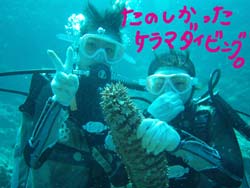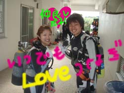 はいさーい☆今日は、ぺーちゃん&みっちゃんとケラマに行ってきましたよ〜☆お天気も良くてダイビング日和でした☆今日は、砂地で癒され三昧♪ドラゴンレディでは羽根を見に行ったり、おとなりのトウマではデバスズメダイがきれいに泳いでいましたね☆最後はケラマハナダイの根に☆ケラマハナダイ綺麗でしたね!!ガーデンイールもたくさんいました♪水中ではヒトデに注意!!下手にかかわると火傷します♪しっかり3の時には2人共アホになりましょう♪OKのサインはスナップをきかせて元気良く☆今日で2人共素敵なダイバーにまた一歩近づきましたね☆笑これからもこの気持ちを忘れずにまた沖縄に遊びに来てね〜☆当たったアイスのくじはさっそく変えてもらいました♪♪また一緒にもぐろうね〜!!まってるよ〜☆ |