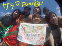 こんにちはぁ☆今日もとぉぉぉ〜ってもイイお天気な沖縄ですよぉぉ♪♪そんな中、わいわいみんなでケラマまで行ってきましたぁ☆今日の愉快なメンバーはあすかちゃん・えりちゃん・はーじぃ・しろーさん・ぎぶんさん・まりまり・銀次郎くん+ヒロさん・ゆーりちゃん・まみの計10名!水中も10名みんなで遊んできました♪今日のポイントは魚の群れがキレイな黒島南、カメさんに大接近!!サンドトライアングル、砂地がキレイなトウマです!今日の1本目ではあすかちゃん☆祝☆50本★★胴上げ+水中でチーズを食す(笑)予想外なトラブルもありましたが^^50DIVEおめでとぉぉぉぉ♪♪そして、2本目ではみんなの前でマスク脱着を披露し無事に銀次郎君★OWダイバー合格で〜す!!おめでとぉぉ☆★☆みなさんこれからも、いろ〜んな海でたっくさぁんの思い出を作って下さいね〜!! |