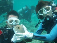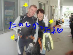 9:00からエンジョイ体験★ダイビングに参加してくれたのは エンジェル&マークです。日本語がまったく解らないという2人なので カタコトの英語で説明!ブレスアウト、イン〜 プッシュプッシュ!などなど何とか理解をしてもらいとにかく海へ 耳抜きを少し理解してもらうのに若干苦労、マークは一度体験ダイビングをやったことが あったのでエンジェルに通訳してくれたりして助かりました、エンジェルは呼吸が始めドキドキしていましたがカタコト英語でクリアー!!水中では写真を撮ったりそれぞれ肺の使い方を教えて自由に泳いだりニモに会いに行きました、バブルリングの時には大きな拍手をありがとう〜ライオンフィッシュやケーブをくぐったり楽しかったですね。次はチャレンジ ダイビングライセンスですよ。エンジェル&マークまた 遊びに来て下さいね! |