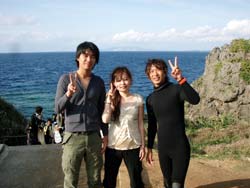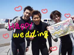 はーーーいっ!今日も笑顔が一番わんたんと、元気が一番さんぺーです!沖縄はここ最近ずっと天気がよく、こんな絶好の天気のいい日にダイビングに来てくれたのは、な、なんと北は、北海道から新婚ラヴラヴの清水さん夫妻と、南からは、福岡からきてくれたねっしーの3人と一緒にと〜っても楽しいダイビングをしてきましたよ〜3人とも会った時から旅先の沖縄で気分上々ハイテンション☆陸上での練習も3人とも、バッチグーで準備万全いざ出発!!水面での練習もとっても上手!さっそく海へ!水中でたくさんの魚に囲まれながら写真を撮ったり、優雅にスイスイ泳いだりしながら有名なポイント青の洞窟まで行ってきました!洞窟の奥から振り返ってみると洞窟の入り口の綺麗さに、3人とも癒されていましたね☆わんたんと、さんぺーは、その時そんな3人を見て感謝感激!!地球に生まれてよかったーーっと水中で2人は会話をしていたのは3人は知るはずもなく・・・(笑)帰りの水中の中では、バブルリングの一発芸を披露してみんな喜んでくれていました〜☆みんな本当にありがとう☆今日の思い出を大切に、僕達も、よりもっとダイビングの楽しさをたくさんの人達に教えていけるよう日々がんばります!!次回また会える日をここ沖縄で楽しみに待ってますネ♪ |