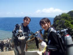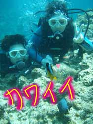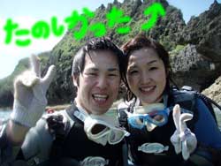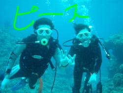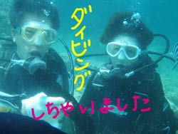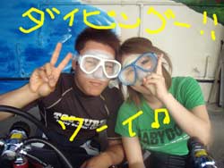 こんにちは★本日2組目の体験ダイバーさんはライセンスをもっているおっくんと初挑戦でドキドキのなっちゃんです。緊張とふあんでガチガチのなったんをスイスイ泳ぎながらも優しく見守るおっくん・・・・・初めは水中世界に戸惑っていましたが、最後の最後には魚にエサをあげたりカメラにピースしたりと余裕が出来ましたね。^0^お魚もいっぱ〜〜いの水中世界を今日は楽しんでもらえましたか???また沖縄に来たら挑戦してみて下さいね〜〜!待ってます! |