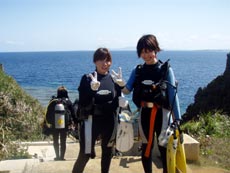 こんにちはーー!!今日は真栄田岬で体験ダイビング★遊びに来てくれたのはみやちゃん・かわちゃん!!2人共少し緊張していましたが、心配していた耳抜きもそんな問題なくバッチリ潜ってきましたー!!たくさんのカラフルな魚に囲まれながら洞窟まで泳いでキレイな蒼の光りをみてきましたーー☆本当に透明度もよくって魚もいっぱいでキレイでしたねーー!!最後にもうスグ誕生日のしのぶさんの誕生日を少し早いけど水中でお祝いしてきましたー!!おめでとー!!また沖縄に来た時は遊びに来て下さいねーー!! |
