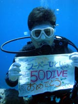 はいさい!ひろあきです☆今日も一日最高の天気になりました☆今日は本島沖ボートの瀬良垣から出港してダイビングです。ゲストは今日が最終日のみっちゃん&ぺーちゃんの2人!初めての本島沖ボートでわくわくどきどきな2人でした^−^今日は「ミニドリームホール」「オーバーヘッドロック」「なかゆくい」の3ダイブ楽しんできました。どこのポイントもうねりがあってエントリーエキジットが大変でしたが、水中は透明度もよく人もほとんどいなかったのでのびのびダイビングできました。ミニドリームではライトをあてても全然びくともしないイセエビが・・・。おもわずスレートに「たべたい!!」って書いちゃいました(笑)オーバーヘッドロックもクレバスや穴を通ったり地形を楽しんできました。そして今日はなんと!!!ぺーちゃんの誕生日!!ということでみんなで水中で盛大にお祝いしました!ぺーちゃん2〇歳おめでとう!!そして三本目ではこれまたぺーちゃんが50本ダイブ達成という事でお祝い!水中で人文字をつくったのですが・・・いまいち(笑)でもみんなと一緒に潜れて楽しかったね。ぺーちゃんは初めての体験ダイビングから一緒に潜ったのですが50本達成も一緒に潜れてよかったです。これからも是非色んな海に潜って楽しんでください!! |