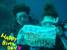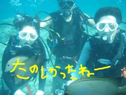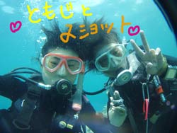 今日の午後から元気にダイビングをしてくれたのは中学生の頃から長〜い付き合いの2人★かなちゃん&しのんちゃんでぇす!!2人は初めてのダイビング♪とっても緊張していたけど荒れている海の中、頑張って潜りましたね!!心配していた耳抜きも上手にこなして砂辺の透き通る水中世界へ(0^^0) 入った瞬間たくさんのお魚さんたちのお出迎え♪必死に?!捕まえようとしてみるものの・・・水中世界は魚の方が強いみたい★笑 たっぷり餌をあげた後はニモファミリーのお家へレッツゴ〜!!大きなニモママに歓迎のチュ〜までしてもらってニッコリ素敵な笑顔(^0^) 意外と余裕だった2人は水中を優雅に泳いでお散歩しましたネ☆空を飛ぶように泳ぐのはとっても気持ちいいでしょ??また沖縄旅行に来たらキラキラ輝く海に潜りに来て下さいね☆お待ちしてま〜す♪ |