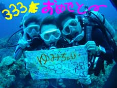 はいさい!今日は ゆみちゃん 333本のお祝いに 慶良間に行ってきましたよ!! メンバーは いつもお茶目なあこちゃんと 確変333本のゆみちゃんです。今日は少し上級者が集まったのでいつもと違うポイントをリクエスト まずは ルカン焦東です。初めてのドリフトにあこちゃんはドキドキしていましたがばっちり大丈夫でした。ゆみちゃんは相変わらず深いところに・・・・ドロップが面白かったね。そしてまずは海物語 アカウミガメを見ることができました。2本目は上城です。ここは途中からかなり流れ出してこれまた 面白かったです。ここでは海物語 タイマイを見ることができました。一緒に写真も撮れました。3本目は黒島南を ドリフトです。かなり流れました。隣のポイントの西まで 透明度もよく、ホワイトチップなどが 泳いでる姿も見れてよかったね。そして 海物語 最後の亀は アオウミガメを見ることができ ゆみちゃん333で 確変で フィーバーです。333本おめでとう〜〜あこちゃんも 次回はマクロマクロで 行きましょう〜! |
