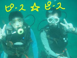 こんにちはーーー!!今日は真栄田岬で体験ダイビングー!!遊びに来てくれたのは幼なじみの仲良しコンビえりなちゃん&ゆうちゃーーん!!元気モリモリの2人がダイビングに挑戦してくれましたー♪しかもしかもDコースという事で2ダイブ!!テンション高めで行ってきましたー★たくさんの魚に囲まれながらプカプカ泳ぎ回ってクマノミを見たり餌をあげたり気持ちよかったですねー!!2本目の洞窟は空腹すぎてかなりやられぎみでしたがバッチリきれいな蒼見てきましたー!!次遊びに来るときはお腹に何か入れてきてねー笑。ライセンスにも挑戦してみてくださーい☆まってまーす!! |