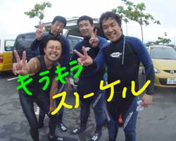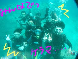 はいはーい!!今日は〜ビーチポイントNO.1の真栄田岬で体験ダイビング〜!!参加してくれたのは〜リョウコさん!マドカさん!ケンジくん!ユウジくん!アイコさんでーす!ほとんどの方が体験済みッと言う事で練習のときもバッチリでしたね!耳抜きなんかみんなほとんど練習いらず!すいすい潜れて行きました!!そして〜今日の青い光も絶好調!!綺麗でしたねー!帰りはみんな1人で泳いで遊んできました!ナスビの一発芸・・・すごい顔でしたね(笑)俺のもうまくいったしよかった〜!また機会があればお店のほうにもよってくださいねー!!待ってまーす! |