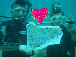 はいさい★しげちゃんです♪ 今日の体験ダイバーは新婚さん☆リュウちゃんとヒロミさんです↑キレイな水中をたっぷり遊んできましたよ♪ まずは緊張でガチガチで質問しまくりのリュウちゃんに(笑)陸上でじっくり説明と練習をして海へ行きました! いざ海に入ってみると経験者のヒロミさんはもちろん リュウちゃんもとっても上手でした♪ まずは襲われてるように見えるくらいのたくさんの魚に餌をあげて遊びました★ その後はゆっくりおよいで「ニモ」のお家へ!!めっちゃ可愛かったですねーー★ 一緒に写真を撮ったり、指を差し出して「チュー」してもらったり♪ あとはナマコで変なポーズをして見たり「サンゴのお花畑」の上をフワフワと泳ぎました!! そして今回のメインイベント!!! サプライズの水中ハッピーウエディング!! (リュウちゃんのオーバーリアクション最高でした★) ハンカチを渡すと2人共大喜び♪ 本当に本当におめでとう!! しげちゃんからも「バブルリング」のプレゼント♪ 沖縄新婚旅行の思い出になったかな? いつまでも笑顔の絶えない夫婦でいてね★ そして今度沖縄にきたらライセンスをゲットして また一緒に潜ろうねーーー♪ |