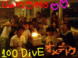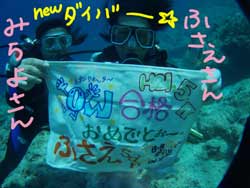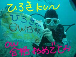 いつまでも・・夢をみている・・馬鹿であれ!!っはーい!!ワンタンでーす!今日は三日間頑張ってくれたOW講習をしてくれたきーたんでーす!初日はウの口ができなくて苦労したし、水もたくさん飲んでしまったけど・・きーたんは根性系?ガッツ系?めげずにチャレンジ精神で二本目でマスク脱まで終わらせてしまいました!!それからは〜スルスルとスキルを終わらせ・・今日卒業の日を迎えました!見事に最後のスキルをクリアして・・・合格!!おめでとうー!!!!終ってからのみんなでの焼肉も美味しかったねー!!今度来るときもダイブして、その後は〜きーたんの好きな酒をたらふく、いただきましょーい!! |