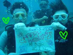 こんにちわ☆しげちゃんです♪今日の体験ダイバーは新婚さーーんのタケシさんとアヤカちゃん♪ 水中でたっぷり遊んできましたよ☆ 陸上でゆっくり説明と練習をして海にいきました☆ 水中はとても蒼くて 魚もたくさんいました♪ 餌をあげるともの凄い勢いで食べてましたね♪ そのあとはゆっくり泳いで海のアイドル「ニモ」に会いにいきました♪ めっちゃ可愛くてしばらく一緒に遊びました☆ あとはナマコで遊んだり 水中のクリスマスツリーを見たり☆ そして最後! 水中でのハッピーウエディング☆ とても喜んでもらえたみたいで良かったよ☆ いつまでもお幸せに って願いを込めて「バブルリング」を披露☆ また沖縄に来たときには遊びにきて下さいね♪ 今度は洞窟ダイビングに行きましょう!! |